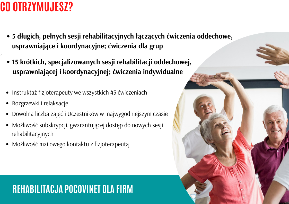 Rehabilitacja POCOVIDNET DLA FIRM to 5 kompletnych, 20to minutowych sesji rehabilitacyjnych z ćwiczeniami odechowymi, usprawniającymi i koordynacyjnymi, z rozgrzewką na poczatku sesji i ćwiczeniami relaksacyjnymi na końcu.